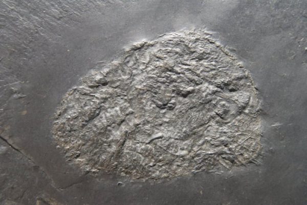 Very rare jellyfish Plectodiscus discoidus from the Devonian of Bundenbach (Hunsrück slate), on unbroken slate slab, detailed specimen.
