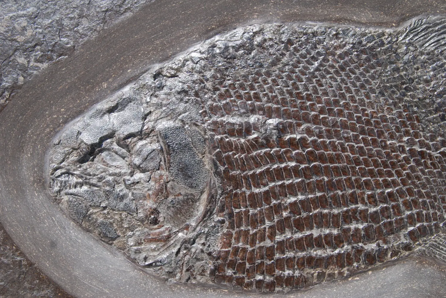 Fossils from Holzmaden impress with their exceptional preservation in fine-grained shale. The anoxic conditions on the seabed prevented decomposition and allowed the detailed preservation of the bony structures and the scaly shell, often with a golden shimmer due to pyritization.