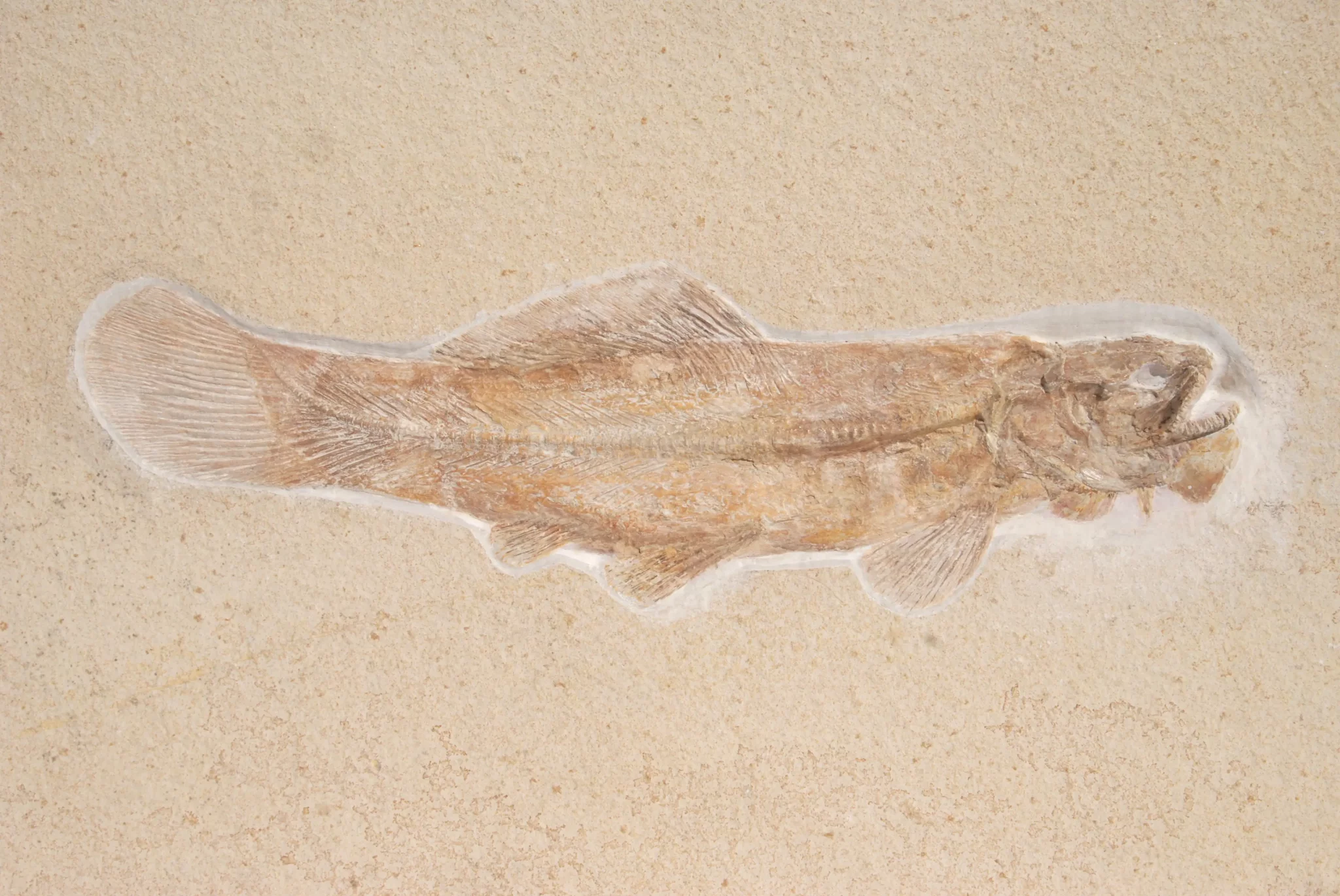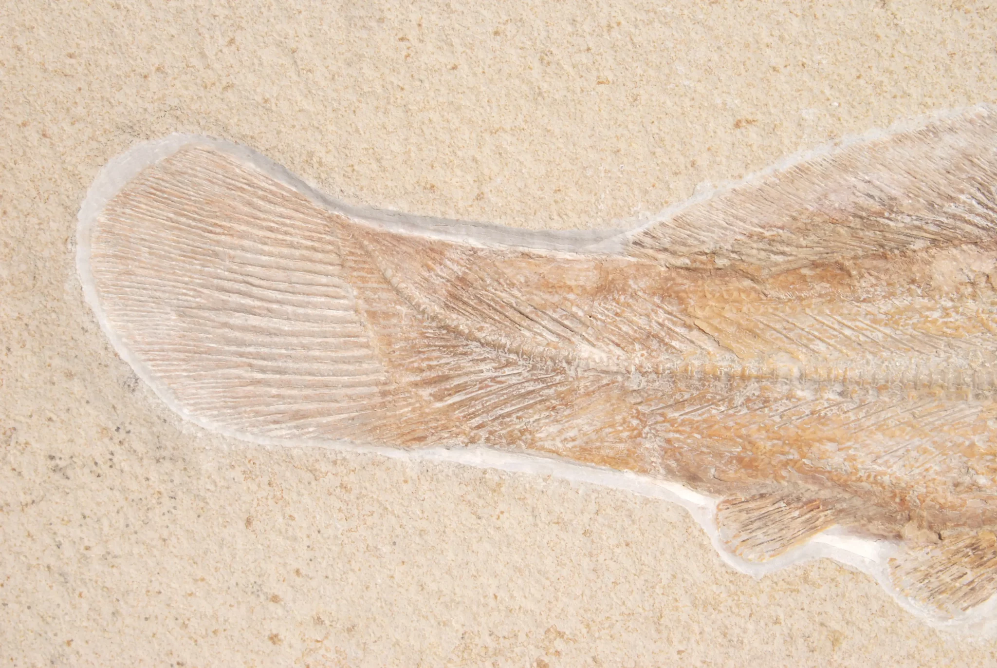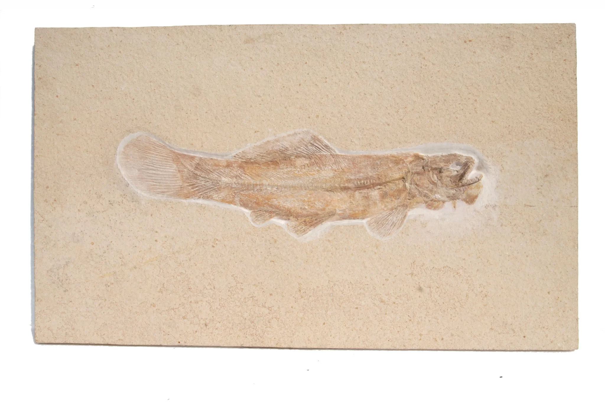 • Caudal fin: The caudal fin is usually rounded or only slightly notched at the rear edge (hemi-heterocercal), which gives the fish a very compact and powerful appearance in the fossil view.