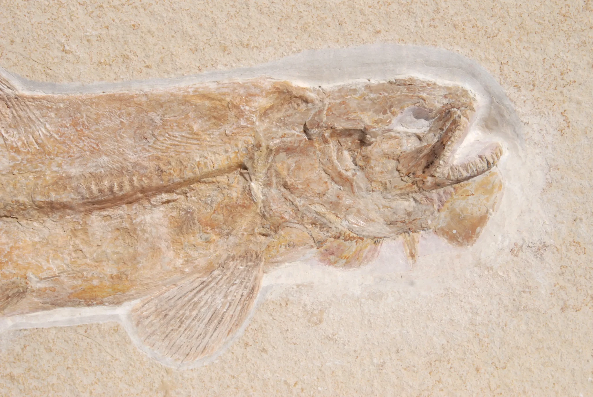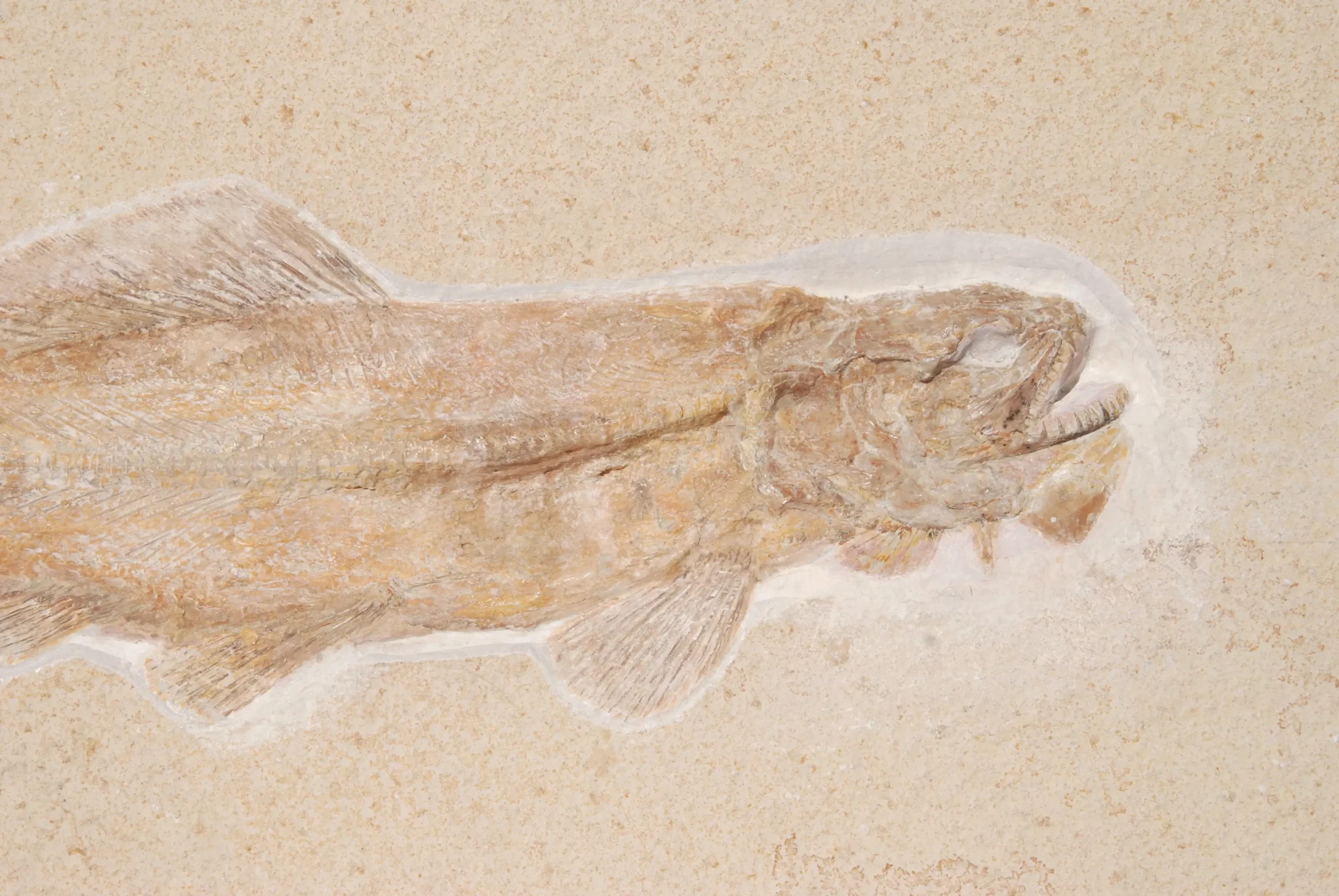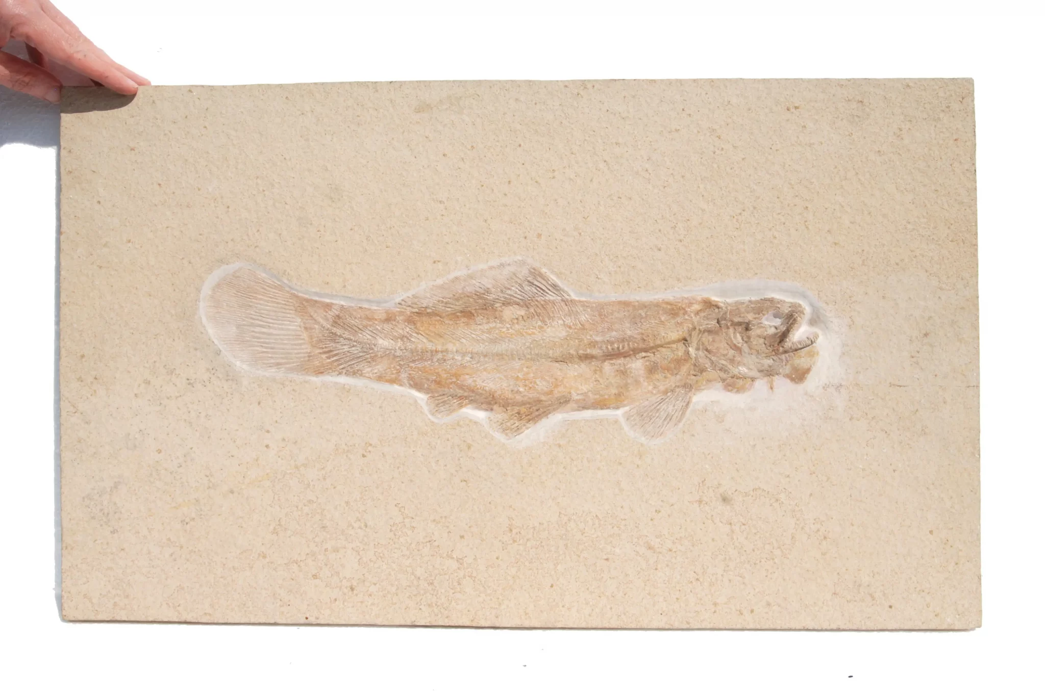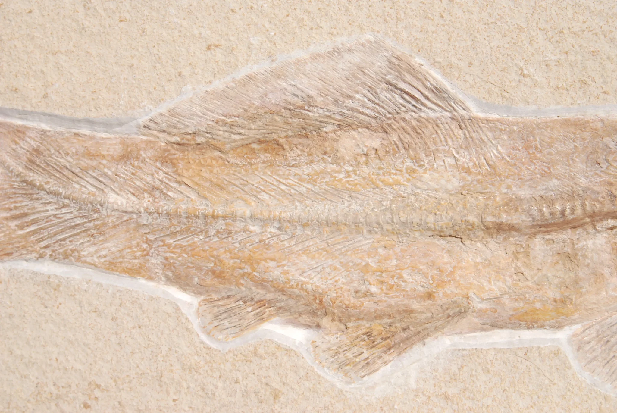 • Caudal fin: The caudal fin is usually rounded or only slightly notched at the rear edge (hemi-heterocercal), which gives the fish a very compact and powerful appearance in the fossil view.
