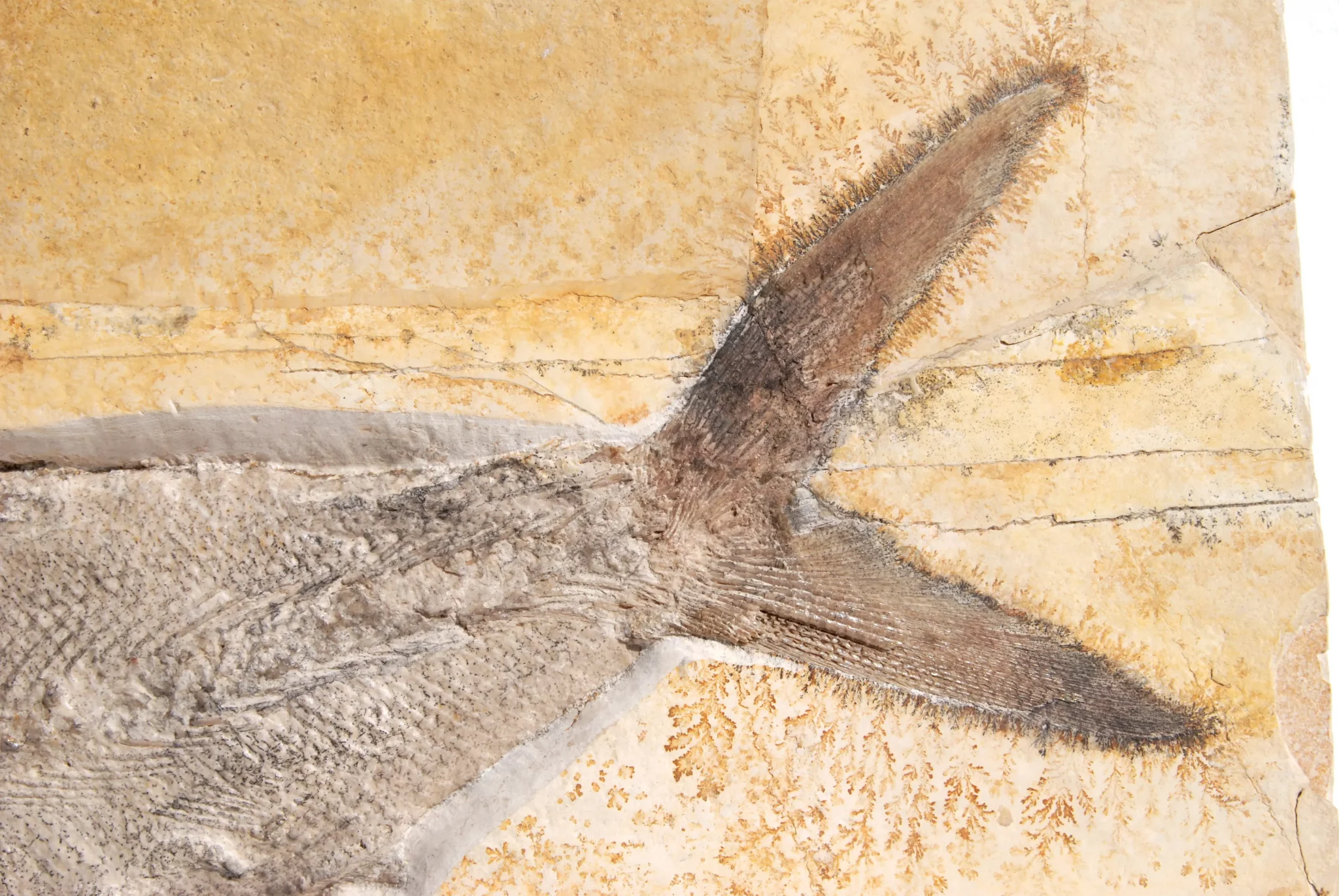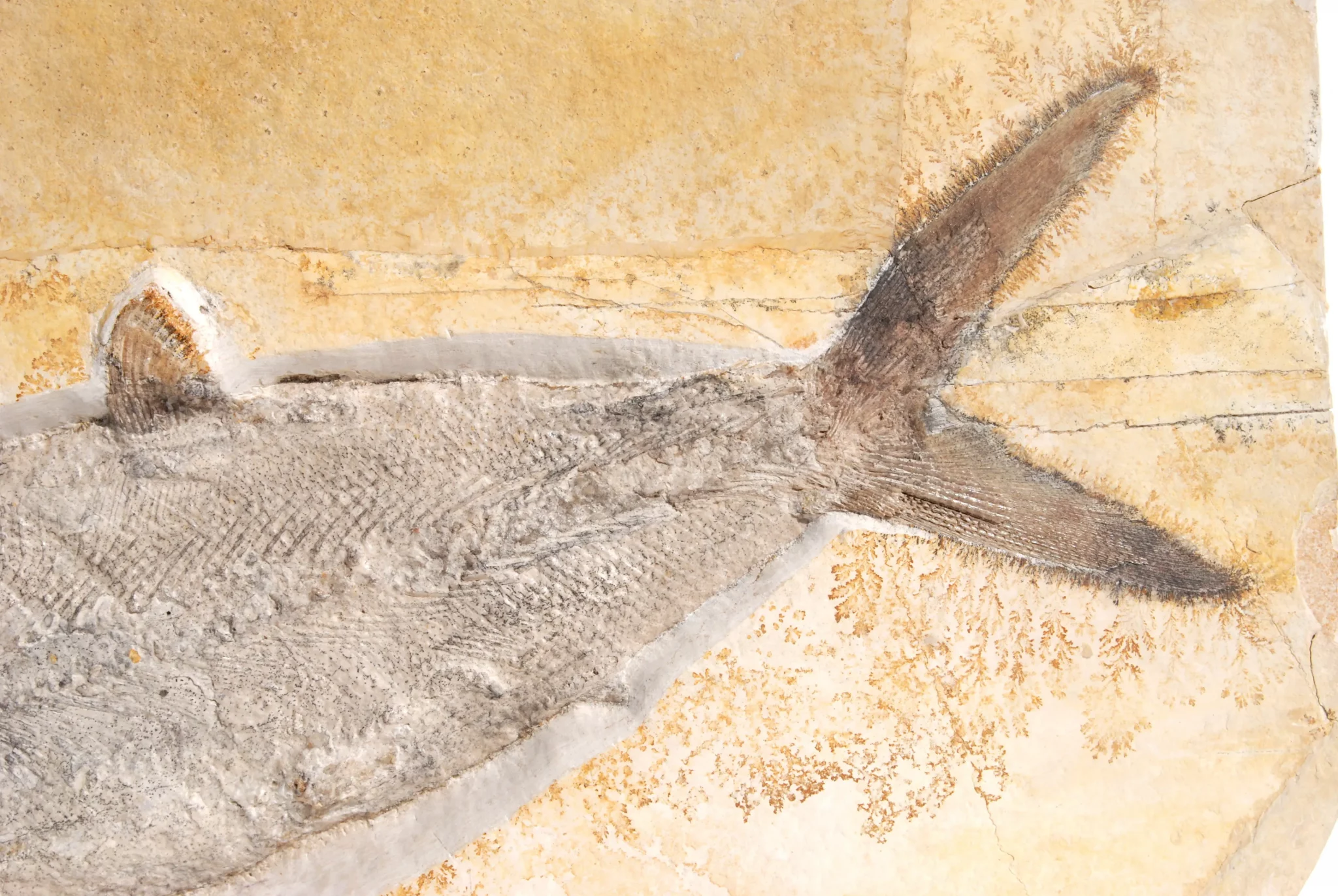 - The distinctive caudal fin (homocercia): Its trademark is the deeply forked, large caudal fin. In top specimens, the individual fin rays are intricately preserved right up to the tips and still convey the impression of power and propulsion today.