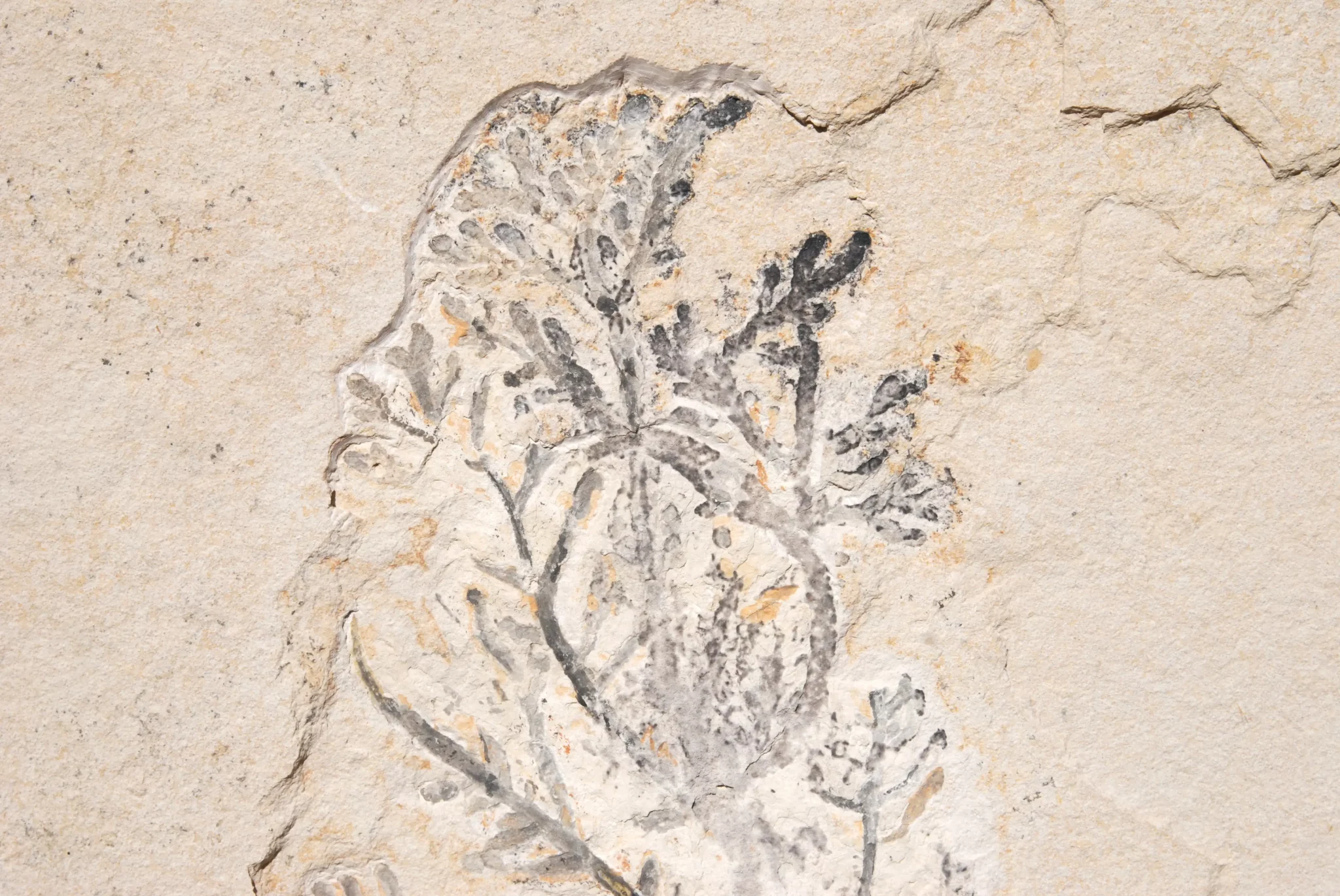 - Color preservation: The organic substance of plant fossils is often traced as a dark carbon film or by manganese dendrites. A deep, dark contrast to the light cream shade of the limestone turns the fossil into a graphic work of art.