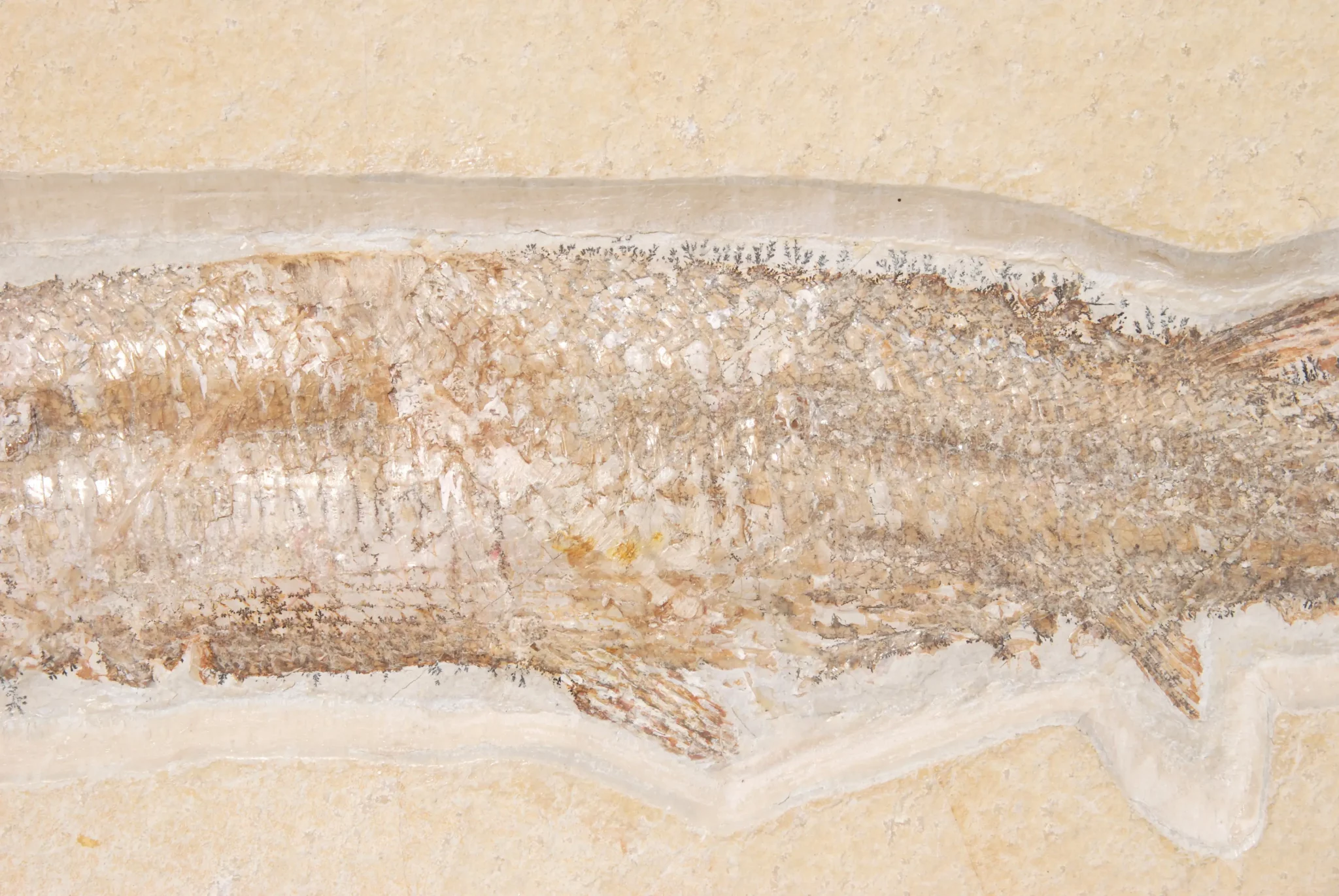 - Die Schuppenreihen: Bei Aspidorhynchus ist die vertikale Anordnung der Flankenschuppen oft in exzellenter Symmetrie erhalten. Der metallische Glanz der Schmelzschicht (Ganoin) bleibt bei guter Erhaltung über Jahrmillionen stabil.